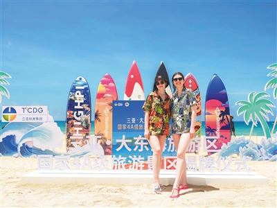 外籍游客在三亚大东海旅游区拍照“打卡”。