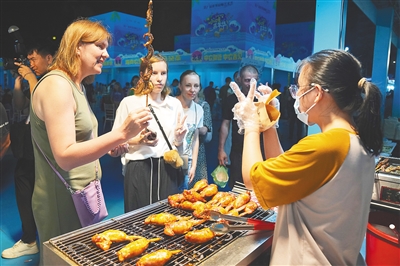 6月26日,第八届世界厨师艺术荟在三亚大东海广场举行,外籍游客在现场品尝美食。