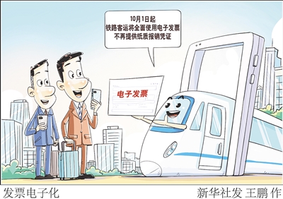据新华社北京9月8日电(记者樊曦)记者从中国国家铁路集团有限公司获悉,10月1日起,全国铁路旅客运输领域将全面使用电子发票,不再提供纸质报销凭证。国铁集团客运部负责人介绍,2020年6月,铁路部门全面实行电子客票,不再提供纸质车票。2024年11月1日起,铁路部门推广全面数字化的电子发票,并将2024年11月1日至2025年9月30日作为过渡期,过渡期内纸质报销凭证、电子发票并行使用。按照国家税务总局、财政部、国铁集团联合发布的2024年第8号公告,2025年10月1日起全国铁路客运领域将全面使用电子发票,旅客本人在行程结束或者退票、改签业务办理之日起的180日内,可通过铁路12306或车站售票窗口、自动售票机申请开具电子发票。