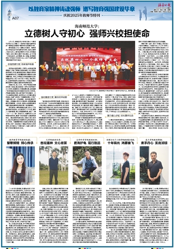 站在新的历史起点,海南师范大学将全面贯彻党的教育方针,落实立德树人根本任务,大力弘扬教育家精神,深化教师教育改革,努力培养更多德才兼备、心怀“国之大者”的“大先生”,加快建设一流师范大学,为建设教育强国、科技强国、人才强国和实现中华民族伟大复兴贡献海师力量!(撰文/罗丽彤 林妙莹 林必恒)