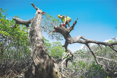 近日,修复团队工作人员在海南三亚铁炉港古红树林,对一棵被台风“剑鱼”拦腰折断的红榄李母树,进行残枝清理和主干修复。海南日报全媒体记者 王程龙 摄