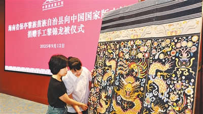 9月12日,海南保亭黎族苗族自治县向中国国家版本馆捐赠手工黎锦龙被仪式在北京举行。当天捐赠入藏的手工黎锦龙被,采用传统黎锦工艺纯手工制作,汇聚纺、染、织、绣四大技艺精华,被面为五龙戏珠、双貔貅、喜上眉梢等吉祥图案,生动展现了黎族人民对美好生活的向往和卓越的艺术创造力。图为仪式开始前工作人员在整理龙被。
