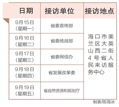 9月15日至19日,省委宣传部、省委统战部、省委网信办、省发展改革委、省自然资源和规划厅相关负责人将在海口市美兰区大英山西二街4号省人民来访服务中心接访群众。