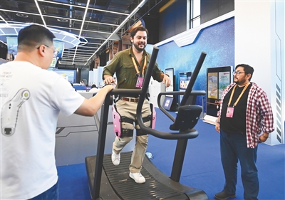 一名外国记者(左二)在服贸会体验“增程动力外骨骼机器人”。 新华社发