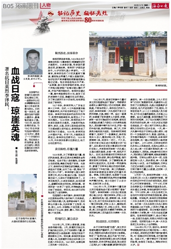■ 陈立超 陈锦爱在琼海市长坡镇大头坡村的苍松翠柏之间,一座革命烈士纪念碑静静地诉说着83年前的英勇与悲壮。它的每一块砖石,都源自当地干部群众最质朴、最真挚的感念之情。1993年,他们用自筹的资金,为1942年在民坡屯血战中牺牲的42位烈士,建造了一个永恒的归宿。而这场战斗的指挥者,就是近日被列入第四批著名抗日英烈名录的李泽民。