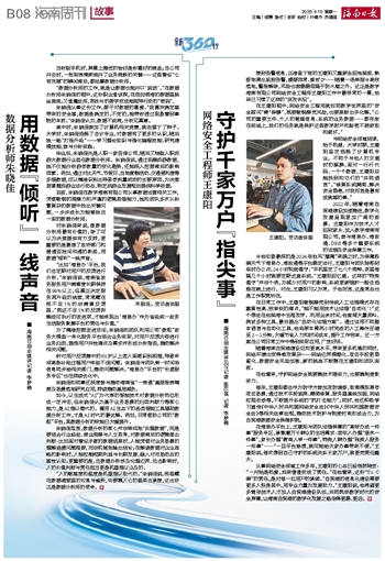 ■ 海南日报全媒体见习记者 陈苡琪 记者 李梦楠接到告警信息,正准备下班的王康阳又重新坐回电脑前,熟练地调出监控告警,溯源异常、查封IP……随着一连串指令高效落地,警报解除,风险也被稳稳阻隔于防火墙之外。这正是数字海南有限公司网络安全工程师王康阳工作中最寻常的一幕,他早已习惯了这样的“突发状况”。