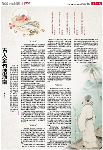 ■ 曾庆江近期,海南省面向全球启动文旅宣传口号征集活动,即用一句话来概括海南的特色,从而为其写一行打动世界的“情诗”。活动开启以来,在社会上引起强烈的反响,各种金句频出,让人对海南心领神会、心驰神往。事实上,在古代海南,南来北往的人物也曾用简短的语言来表达对海南的印象或者情感,从而打造了海南“名片”,成为代表海南形象的“金句”。