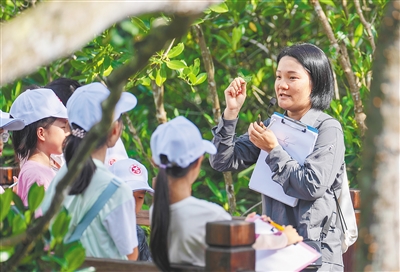 9月14日,“”自然笔记创作活动在海口东寨港湾举行。34名生态环境保护青少年志愿者在自然导师带领下,近距离观察、记录和探索红树林里的动植物奥秘,并完成自然笔记作品,优秀作品将有机会推荐参加全国青少年自然笔记大赛。