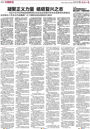 庄严隆重、大气磅礴、震撼人心、激励奋进,纪念活动成功举办,在强国建设、民族复兴的历史征程中镌刻下浓重的一笔。习近平总书记在重要讲话中强调,纪念活动“进一步弘扬了伟大抗战精神,进一步坚定了全面推进强国建设、民族复兴伟业的信念信心,进一步展示了推动构建人类命运共同体的责任担当”。