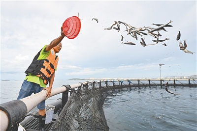 9月17日,陵水黎族自治县黄鳍金枪鱼海上养殖示范基地工作人员在给金枪鱼喂食。经过数年技术攻关,中国水产科学研究院南海水产研究所已在陵水建成国内首个黄鳍金枪鱼海上养殖示范基地,目前已实现人工产卵孵化。近年来,海南发挥海洋渔业优势,持续培育渔业新质生产力,加快推动渔业高质量发展。