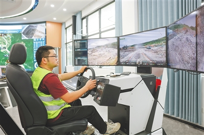 9月17日,在定安县大岭花岗岩矿项目现场,工作人员监测无人驾驶矿卡的运行情况。据悉,该项目运用AI技术,构建5G+无人驾驶矿卡、智能巡检机器人、AI粒径监测系统、智能库存系统、集成自动装车等多种应用场景,助力绿色矿山向数字化、智能化、无人化高质量转型升级。新华社记者 张丽芸 摄