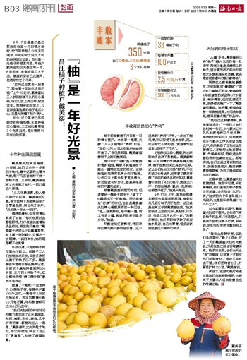 她算了一笔账:一亩地种约33棵柚子树,每棵年产量100斤左右,一般每年6月初开始采收。按平均销售价格2.5元每斤算,年均销售额可达300万元左右。