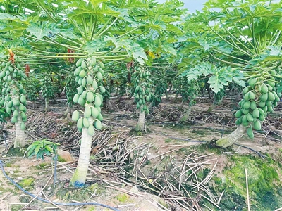 近日,海南日报全媒体记者走进位于三亚市育才生态区的一个木瓜种植基地,只见一棵棵木瓜树硕果累累。小雨过后,空气中弥漫着果香味,眼前一派丰收景象。