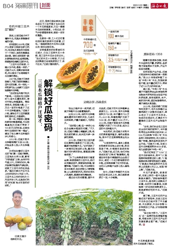 “我们还制定了‘1358’三亚木瓜标准体系:其中‘13’是指果肉甜度要达到13度;‘15’是指比传统品种的木瓜在树上多挂果15天以上,果实表皮要有明显的5道黄,实现‘树上熟’;‘18’是指三亚地处北纬18度,全年平均气温高、日照长,更适合木瓜的生长,种出全国更优品质的木瓜。”汪斌才说。