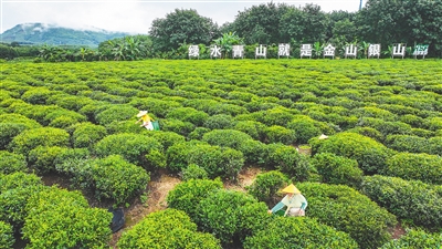 近日,白沙黎族自治县陨石坑里的万亩茶园一碧千里,茶树层层叠叠,茶农穿梭其间,忙着采摘新鲜茶叶。海南日报全媒体记者 张茂 摄