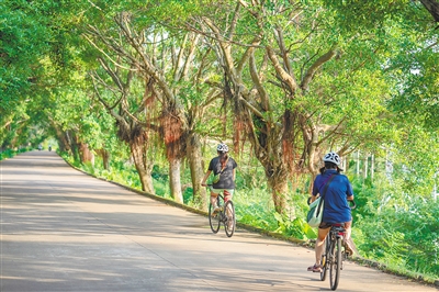 在海南师范大学附属中学西侧,南渡江堤坝上的细叶榕枝繁叶茂,浓密的树冠几乎将整条道路笼罩,形成一道天然的绿色长廊。与海口主城区隔江相望,这里不仅满目葱茏、绿意盎然,更可感受到对岸乡村传来的质朴“烟火气”。