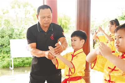 周道雄为屯昌武术夏令营活动学员传授拳术。通讯员 林小丹 摄