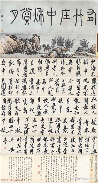 《有竹庄中秋赏月图》卷,由卷首篆书、画芯、题识诗、跋语(书法)等几部分组成,为纸本,总长达10多米,是沈周的书画巨制。其中的题识诗,书体为行书,结体严整,笔法沉着稳健,苍劲老练;线条锋利铦锐,结构跌宕开阖,中宫收紧而四维开张,可谓“长撇大捺”,遒劲奇崛。这是典型的沈周书法特点,也可从中窥见其学习黄庭坚书法的影子。