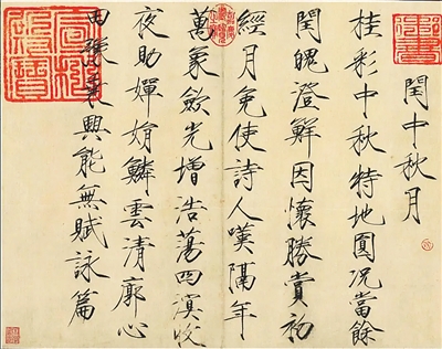 “雨晴秋色满长安,月贯黄云百宝团。见说清光天下共,不图今夜客中看。天垂紫禁星河淡,江绕金城风露寒。吹断碧箫丹桂发,玉人何处倚阑干。”这是文徵明晚年居金陵(今江苏南京)时,于中秋节写下的一首七律诗,题为《金陵中秋》。作者通过诗句和书法的交融,抒发自己的中秋情思。全诗用生动的笔触勾勒出一幅中秋雨后的夜景图:月色穿透云层,古都披上一层银辉;天穹之上,明月高悬,星河淡然;皓月、星空、江水、秋风中的桂花树和凭栏远眺的女子,构成了层次丰富、井然有致的中秋之景。诗中多处细腻的描写,让人隐约感受到了作者的思乡之情。
