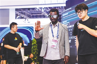 外籍客商(左)在第四届全球数字贸易博览会人工智能展区体验智能眼镜设备。