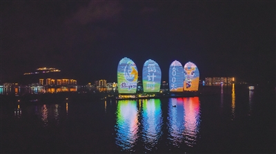 10月3日晚,三亚凤凰岛等地标建筑披上“亚沙元素”,亮起第六届亚洲沙滩运动会主题灯光。通讯员 黄东光 摄