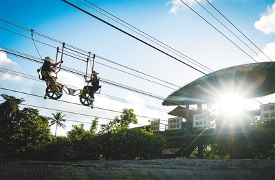 10月3日,游客在保亭槟榔谷景区体验惊险刺激的高空滑索自行车项目。海南日报全媒体记者 宋国强 摄