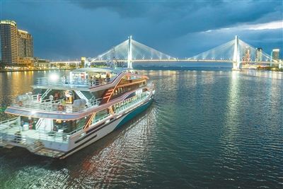 国庆中秋假期,市民游客乘游船徜徉海口湾,看华灯初上,赏滨海美景。海南日报全媒体记者 李天平 摄