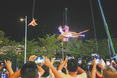 10月3日晚,三亚大悦城举办“凤凰飞天”节目表演,吸引大批观众欣赏。海南日报全媒体记者 王程龙 摄