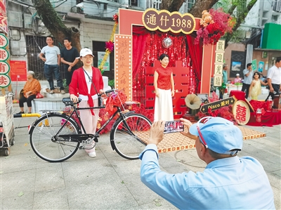 在街区氛围营造上,活动从视觉、听觉等多个角度精心复刻上世纪80年代场景。霓虹灯牌与老式广告旗交相辉映,老邮筒、二八大杠自行车等充满年代感的怀旧物件点缀在街区各处,循环播放上世纪80年代的流行歌曲,瞬间将游客拉回昔日时光。