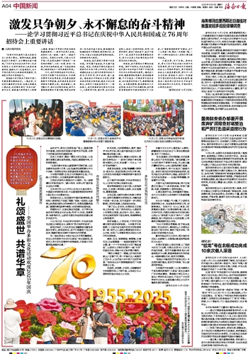 “实现中华民族伟大复兴是前无古人的伟大事业。憧憬和挑战,都激发我们只争朝夕、永不懈怠的奋斗精神。”习近平总书记在庆祝中华人民共和国成立76周年招待会上发表的重要讲话,激励亿万人民奋楫笃行,为以中国式现代化全面推进强国建设、民族复兴伟业而团结奋斗。