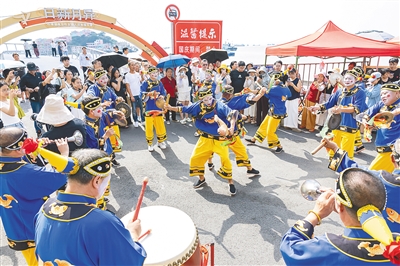 10月1日,游客在浙江省温岭市石塘镇里箬村码头观看大奏鼓表演。