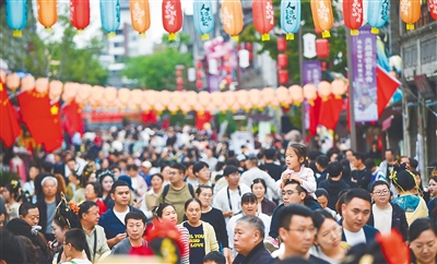 10月2日,游客在河南省洛阳市老城区历史文化街区洛邑古城景区休闲游玩。