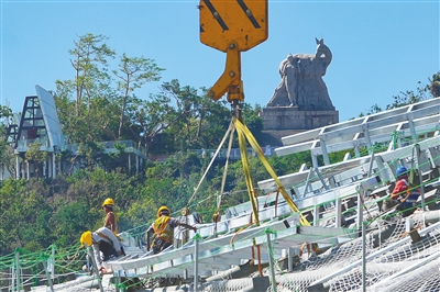 国庆假期期间“双中心”共有1396名工人在岗坚守。交流中心项目正在进行主体二层结构、部分三层结构施工,以及地下室外墙的防水施工,项目预计11月底完成主体结构封顶,将在12月进入装饰装修施工阶段。交易中心项目室内已全面进入装饰装修施工阶段。