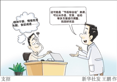 新华社西安10月7日电(记者蔺娟)国庆中秋假期即将结束,有些人会感到精神不振、情绪低落,并伴有失眠、食欲减退等生理不适。专家表示,这可能是“节后综合征”来袭,可以从作息、饮食、运动等多方面进行调整,找回好状态。空军军医大学唐都医院神经内科心身门诊教授张侃指出,“节后综合征”并非严格的临床疾病诊断,而是指个体在长假后,从放松状态回归日常轨道的过渡期中,出现的短暂身心适应不良。主要表现包括:情绪方面,提不起精神,对工作感到厌倦、恐惧、焦虑,甚至莫名烦躁、情绪低落;生理方面,失眠、早醒、疲劳乏力、头痛、头晕、食欲不振、肠胃不适等;认知方面,注意力难以集中,记忆力下降,思维迟钝,工作效率大打折扣。