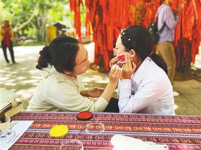 游客在海南石花水洞地质公园体验脸部手绘。