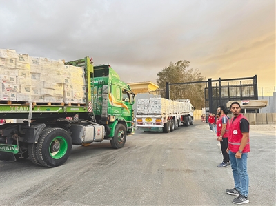 图为10月12日,载有人道主义援助物资的卡车在埃及红新月会工作人员的监督下从拉法口岸埃及一侧驶向加沙。