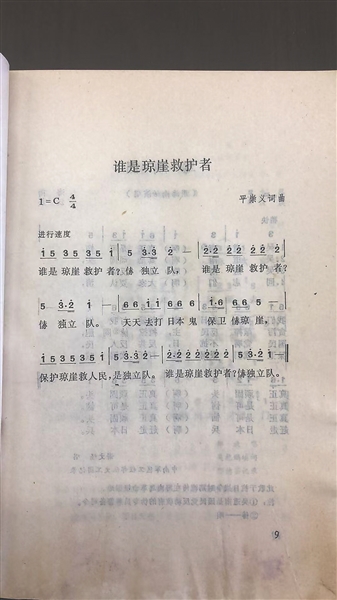《谁是琼崖救护者》的原词署名作者为“平崇义”,原词为:“谁是琼崖救护者,亻赤(方言,相当于‘咱’)独立队,天天去打日本鬼,保卫亻赤琼崖,保护琼崖救人民,是独立队。”这段歌词通俗生动地描述了中共琼崖特委才是海南抗战的中流砥柱。据《海南省志·文化志》记载,“平崇义”为琼崖特委文艺宣传干部,他也是抗战歌曲《独立队之歌》《全琼总动员》的作者。《独立队之歌》较短,采用海南民歌曲调,歌词为:“独立队,打日本鬼,保护百姓,枪炮缴获,几百枝(支),四海扬名。”这首歌展现了琼崖抗日独立队保护百姓、抗击日本侵略者的功绩。《全琼总动员》歌词稍长,其中写道:“有力快出力,有钱快出钱,快扩大我们抗日独立队,一切为着打日本呀,嘿,争取最后胜利!”这首歌采用的是陕北民歌曲调,抗战时期广泛流传于琼崖抗日根据地,在这首歌曲的鼓舞下,根据地许多地方出现了母送子参军、妻送夫参军的感人场景,反映出海南人民与我党领导的琼崖抗日武装之间的鱼水深情。