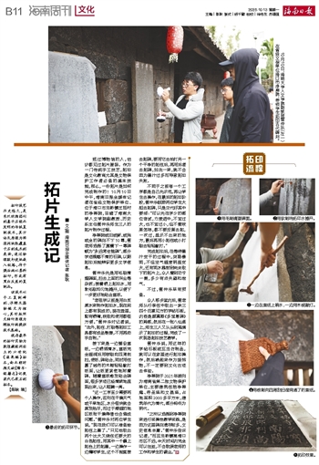 逛过博物馆的人,估计都见过拓片展陈。作为一门传统手工技艺,拓印是文化教育尤其是文物保护工作者必备的基本技能,那么,一份拓片是如何完成制作的?10月10日中午,海南日报全媒体记者在省级文物保护单位、位于海口市龙桥镇王廷村的净禅院,目睹了海南大学人文学院副教授、历史系主任管仲乐师生三人的拓片制作过程。
