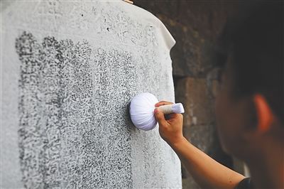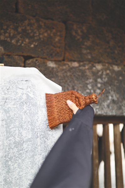 3 一边在宣纸上喷水,一边用木槌敲打。