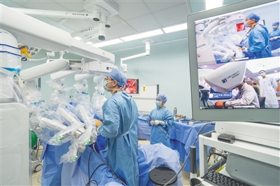 上海瑞金医院专家远程操控海南医院的手术机器人,为患者切除胰体尾。图为瑞金海南医院手术室现场。海南日报全媒体记者 袁琛 摄