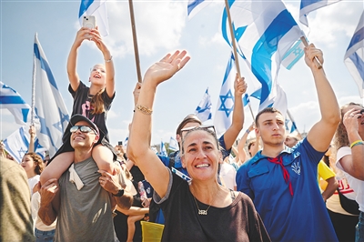 图为13日人们庆祝搭载获释以方被扣押人员的直升机抵达以色列佩塔提克瓦的一所医院。