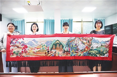 五指山市工作人员展示壁挂式黎锦作品《四季同辉·巾帼逐梦》。