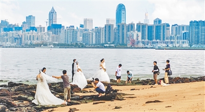 10月12日,在海口市西海岸海滩,拍婚纱的新人络绎不绝,白色婚纱与金色沙滩构成浪漫画面,成为海岸线上的独特风景。海口西海岸凭借开阔海景和松软沙滩,成为新人拍摄首选地。海南日报全媒体记者 陈元才 摄