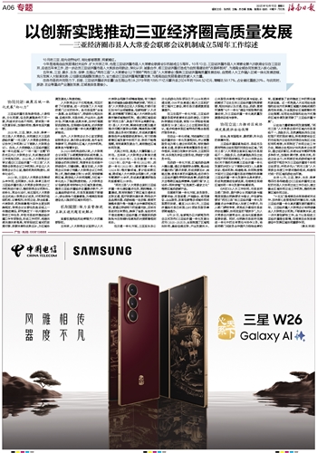 在旅游一体化方面,区域旅游品牌火爆出圈,通过多维度联合营销,整合经济圈内热门景点资源,形成资源互补、线路互推、信息共享的共赢格局;成功举办三亚经济圈热带雨林挑战赛、旅游发展大会等跨区域品牌赛事;创新打造“水上运动+雨林穿越”“红色演艺+疍家文化”等跨区域旅游新产品。