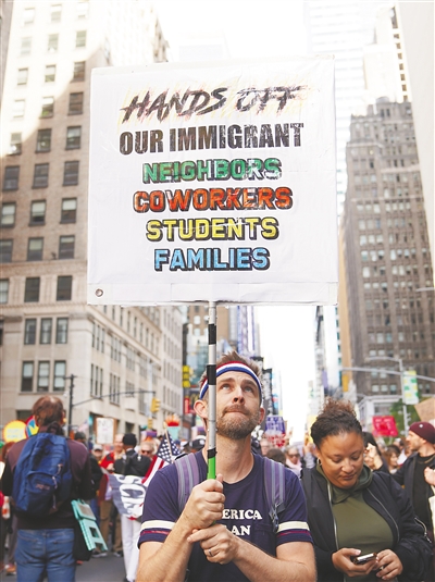 包括纽约、洛杉矶、华盛顿、芝加哥等主要城市在内的美国多地18日举行示威游行,反对暴力打击移民、强行派遣国民警卫队进入美国城市、加征关税等多项特朗普政府执行的政策。组织者称,参加抗议者多达数百万人。在纽约,超过10万人参加了当天的示威游行,其中包括美国国会参议院民主党领袖查克·舒默。当地时间11时许,大批人群陆续向曼哈顿的时报广场集结,许多人手举写有“美国移民与海关执法局离开街头”“宪法不是可有可无”等字样的旗帜和横幅,高呼“没有法治就没有和平”等口号,游行队伍随后向曼哈顿下城缓慢行进。