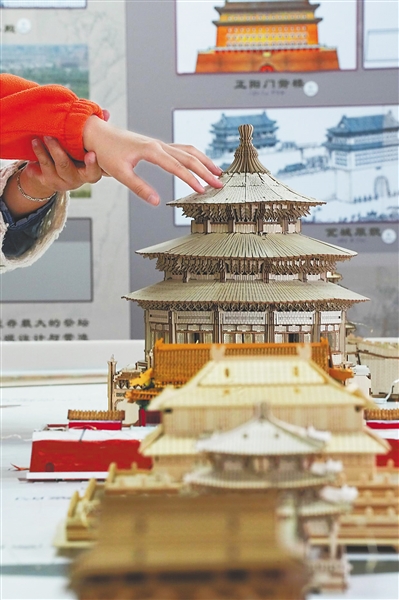 视障人士在工作人员帮助下,触摸北京中轴线建筑模型。 新华社发