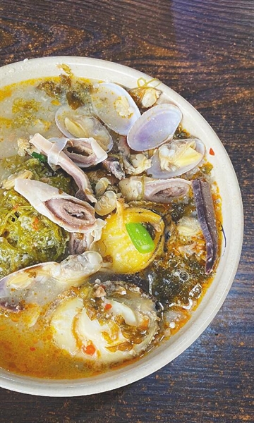 基础版—酸水粉:最原始、最经典的街头小吃,将海带、海螺、石葱等简单配料烫熟,放入碗中,浇上滚烫的糟粕醋汤,再配上一撮海南米粉。酸辣开胃,能快速补充能量。