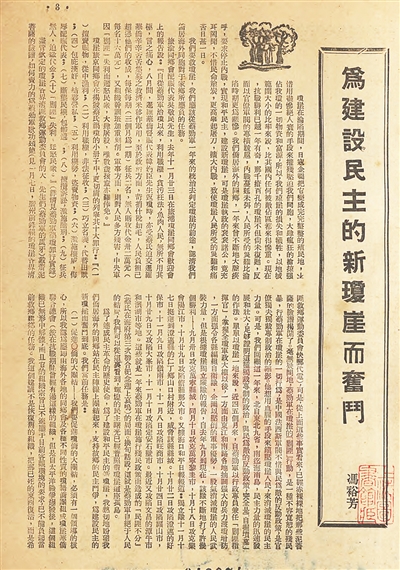 冯裕芳文章《为建设民主的新琼崖而奋斗》(原刊于《琼声》1947年第2期)。 林芳华 提供