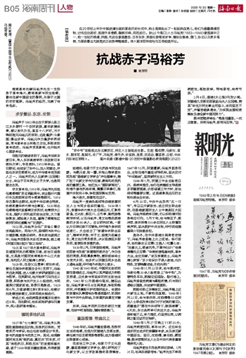 1939年2月,日军登陆海南。冯裕芳迅即参与发起“琼崖难民救济会”,作为当选的常委,积极募款筹物,援助前线将士与受灾乡民。他多次以民盟及同乡会名义通电全国,呼吁海外侨胞齐心救乡。