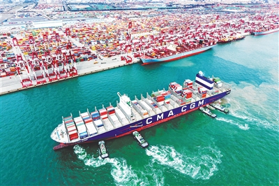 十月二十日,在山东港口青岛港,一艘货轮在拖船辅助下停靠集装箱码头。